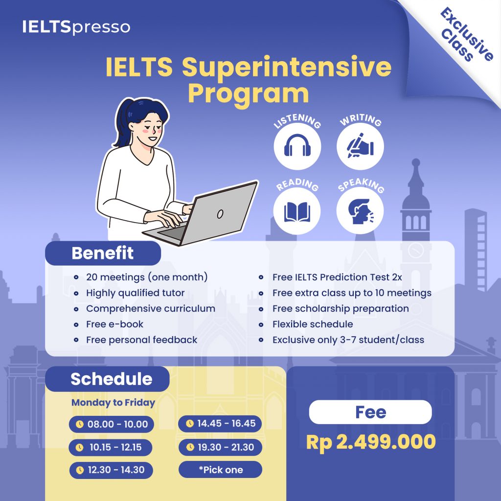 Program bimbingan persiapan IELTS yang paling cocok buat Sobat yang punya target tes dalam waktu dekat atau 1-2 bulan ke depan. Semua hal-hal yang perlu kamu tau tentang soal IELTS dan bagaimana strategi terbaik menghadapinya ada di sini, Sob. Semua materi dilahap dalam 1 bulan. Bonus kelas pengayaan hingga 20 jam bila kamu akan tes IELTS. Makanya ga salah kalau program ini jadi salah satu program terfavorit yang paling banyak menghasilkan alumni sukses dalam tes IELTS!
